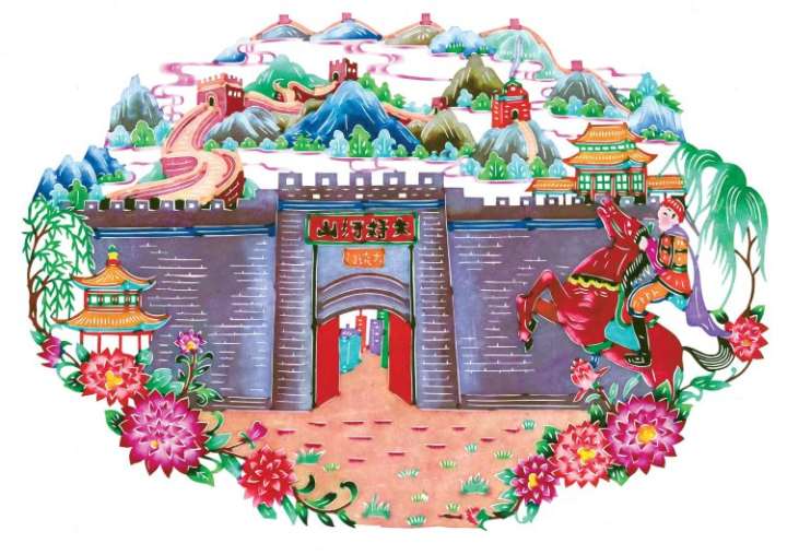 由河北省非物质文化遗产代表性项目抚宁剪纸省级代表性传承人姜艳华创作的《天下第一关》,以威武雄壮的“天下第一关”箭楼为主体,描绘了长城沿线的自然风光和人文地貌,以及文旅融合视角下,旅游业的发展与繁荣。作者把长城的精神面貌用大众看得见、读得懂的形式展现出来,以剪纸艺术拓展长城文化、长城精神的传播力和影响力。