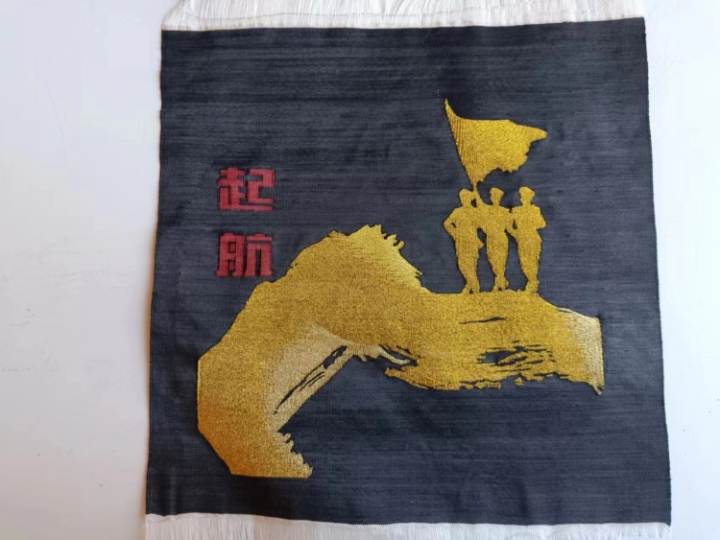 缂丝《起航》由河北省民间工艺美术大师、国家级非物质文化遗产代表性项目缂丝织造技艺(定州缂丝织造技艺)市级代表性传承人王鹏巍所作,作品工艺用时26天,以金丝线缂织中国军人高举旗帜,昂首阔步而来,脚下金色之路延伸向远方;以红色丝线缂织“起航”二字,寄托了作者对祖国的美好祝愿。
