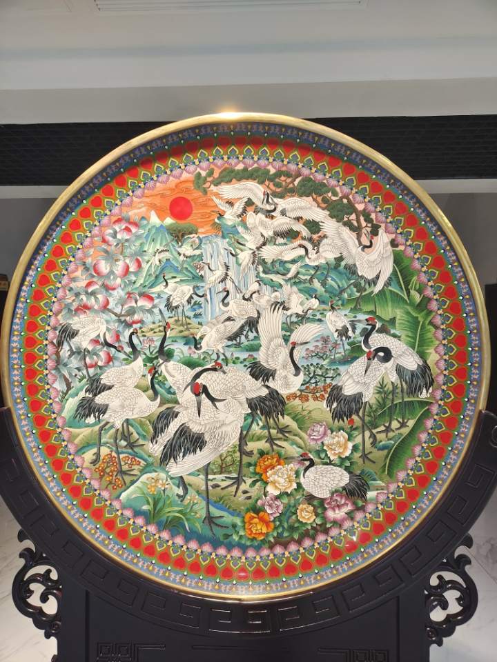 景泰蓝《红心向党》是由廊坊的国家级非物质文化遗产代表性项目景泰蓝制作技艺国家级代表性传承人李荣魁设计监制,作品中一轮红日从东方冉冉升起,霞光万道,照耀山河,旨在表达中国共产党波澜壮阔的百年奋斗历程,展望中华民族伟大复兴的美好前景。作品周边100颗红心紧密相连,体现全国人民紧密团结在一起,红心向党,在第二个一百年砥砺前行的美好寓意。