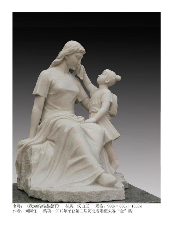 曲阳石雕《我为妈妈擦擦汗》出自国家级非物质文化遗产代表性项目曲阳石雕国家级代表性传承人刘同保之手,该作品采用具象雕刻手法,塑造了一位小女孩踮着脚为妈妈擦汗的感人瞬间。作品衣褶流畅、眼神顾盼、栩栩如生,赞颂了真挚的母女情。