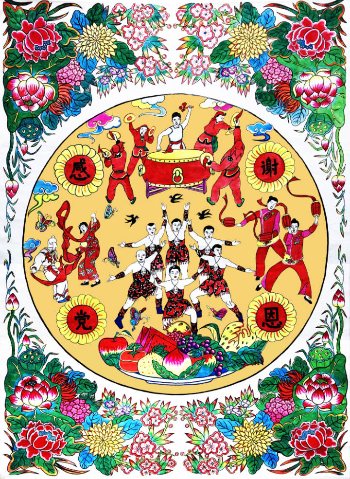 木版年画《感谢党恩》由衡水武强木版年画艺人耿雅雯所作,作品描绘了人民群众在祖国大花园中,用当地传统的打花膀、秧歌等表演迎接党的二十大胜利召开,展现了广大群众以最热烈、纯朴的方式表达对党的感恩之情。