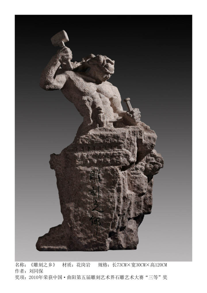 曲阳石雕《雕刻之乡》由国家级非物质文化遗产代表性项目曲阳石雕国家级代表性传承人刘同保创作,该雕塑材质为花岗岩,长73厘米、宽30厘米、高120厘米,作品以雕刻艺人为创作主题,并以夸张的表现手法,展现了中华民族生生不息、敢于开拓、精益求精、勇攀高峰的工匠精神。