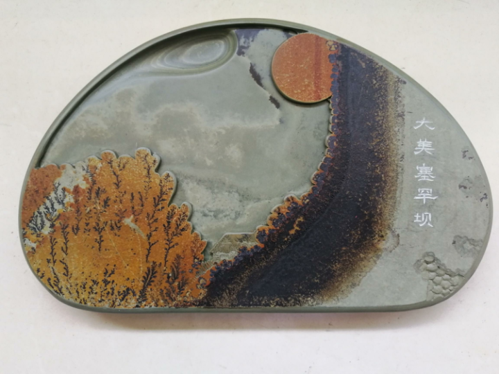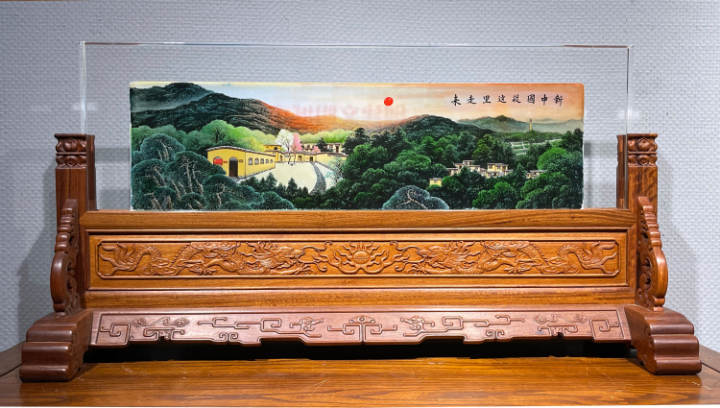国家级非物质文化遗产代表性项目砚台制作技艺(易水砚制作技艺)省级代表性传承人韩金宝创作的《大美塞罕坝》,由天然易水水锈石雕刻而成,巧妙利用石材的天然俏色,精雕细琢,天然生成的松林恰如塞罕坝美景。一轮红日磅礴而出,群山缭绕云卷云舒,林旁山间农舍更显惬意幽静。