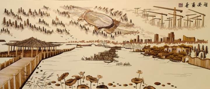 河北省非物质文化遗产代表性项目安新芦苇画省级代表性传承人杨丙军的作品《雄安画卷》,以雄安新区千年秀林、雄安高铁站、白洋淀长廊为创作背景,展现雄安新区塔吊林立、热火朝天的建设场景和美丽的水乡风情,充分表达了雄安新区人民对美好未来的期盼。