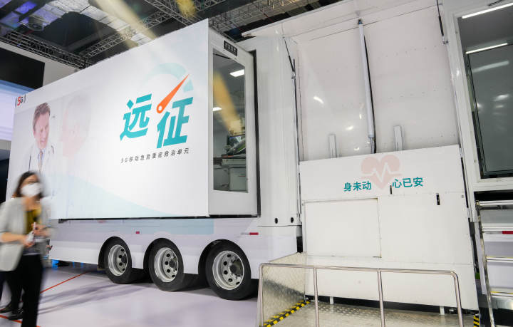 11月6日在第五届进博会医疗器械及医药保健展区西门子展台拍摄的“远征”5G移动急危重症救治单元。新华社记者丁汀 摄