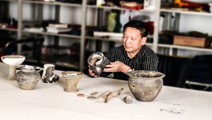 张文瑞在研究出土器物。 受访者供图