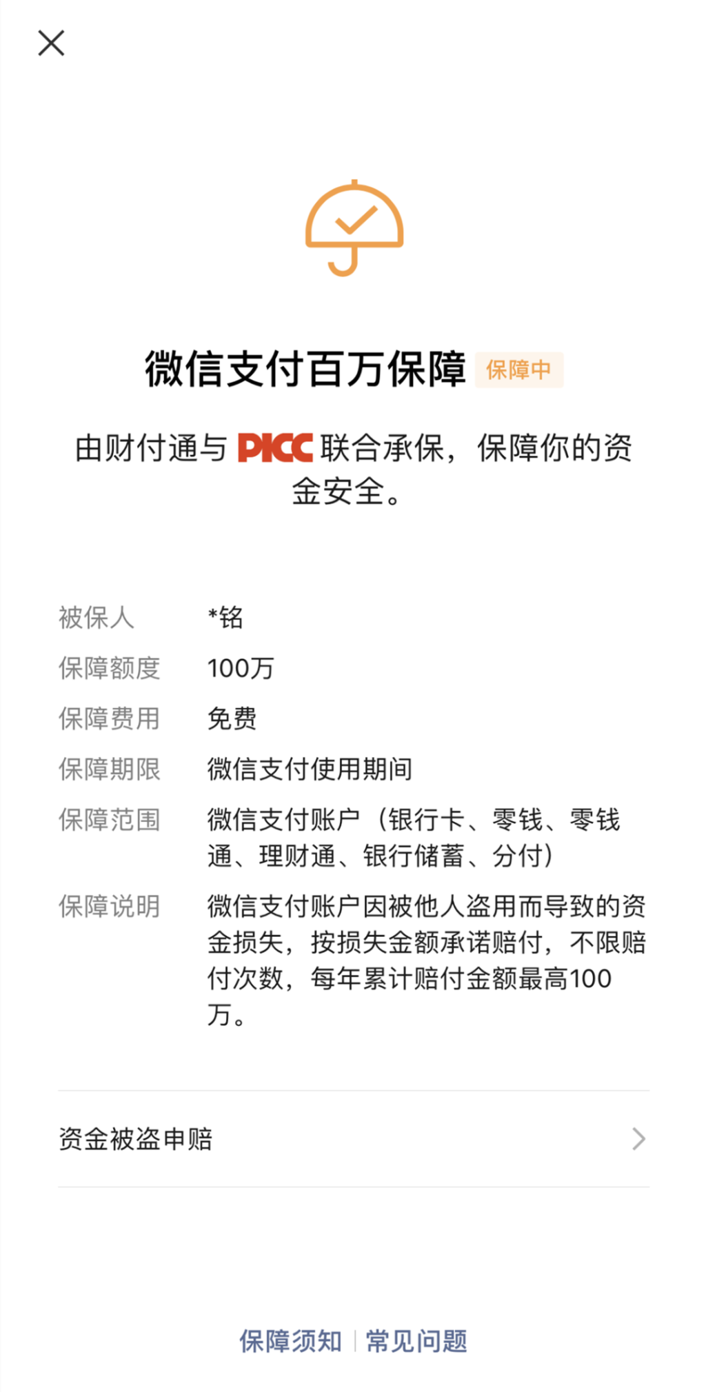 微信“百万保障”功能在微信钱包中的“消费者保护功能”里,为系统自动开启,属于安全保障的一种,支付宝也有此功能,都免费且不影响征信。凡是以不关闭微信“百万保障”业务会影响个人征信、按月扣费、影响理赔等为由要求转账的,都是诈骗!