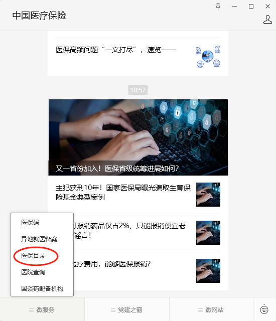医保药品目录中的药品信息可以通过“中国医疗保险”微信公众号当中的微服务查询;或进入微信小程序——国家医保服务平台,点击“查询服务”,找到“药品分类与代码”,进入查询页面。输入具体药品名称,点击搜索,即可了解该药品是否在目录内、所属药品分类以及具体报销类别等详细信息。