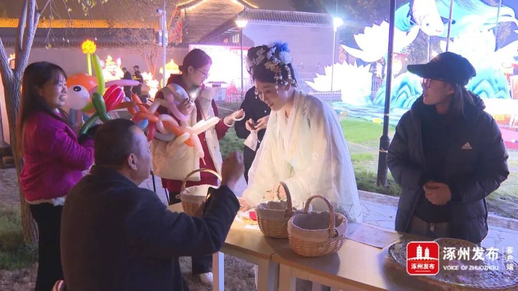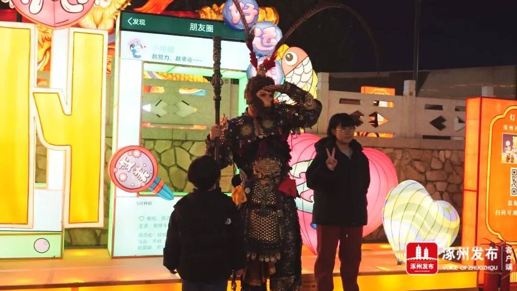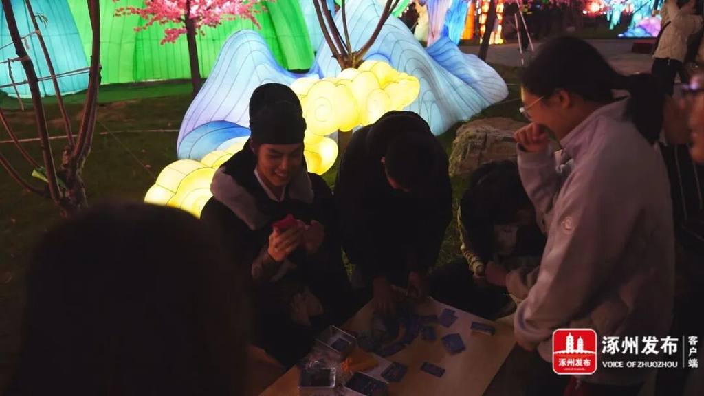 互动体验的升级更是让灯市“活”了起来。园区内新增的数十名NPC身着精致服装,化身“涿水女神”“黑悟空”“刘关张”等角色,热情邀请游客参与投壶、猜谜、套圈等游戏,主动与游客拍照合影,成为灯市中最受欢迎的“打卡点”。游客们还可以凭游戏中获得的仿古钱币兑换精美礼品。让大家既能流连于璀璨花灯的视觉盛宴,又能在趣味互动中收获游玩的快乐,真正实现“赏灯景、玩游戏、享体验”的全方位乐趣。