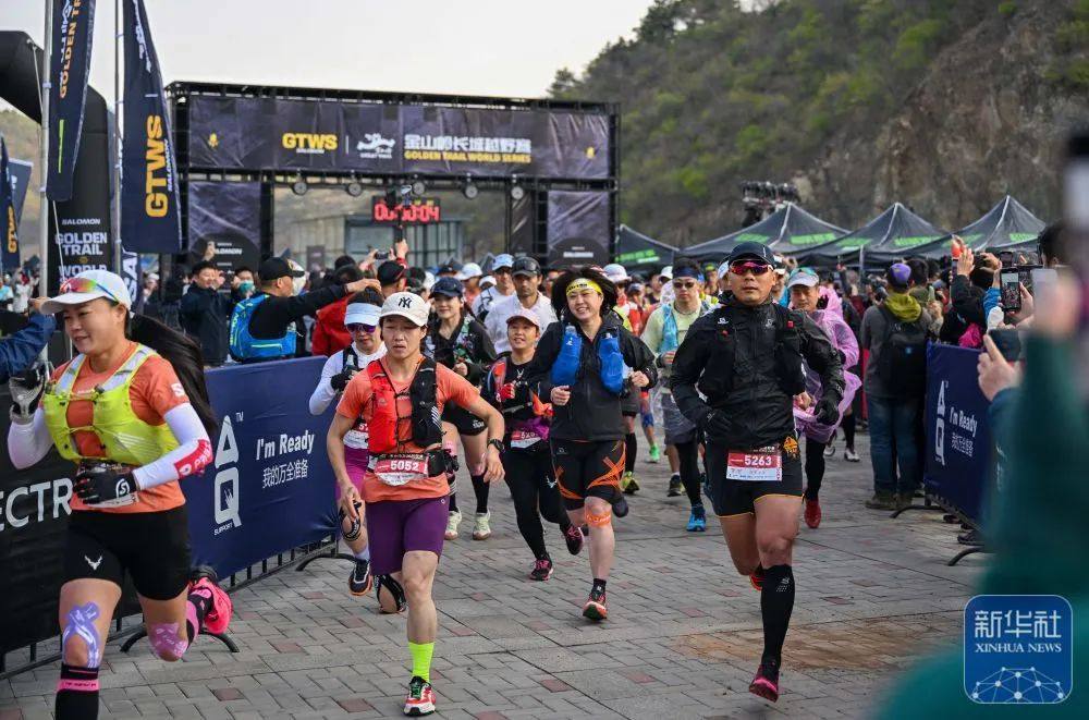 金山岭长城越野赛黄金联赛世界系列赛(中国站)的参赛选手在比赛中出发。图片来源:新华社