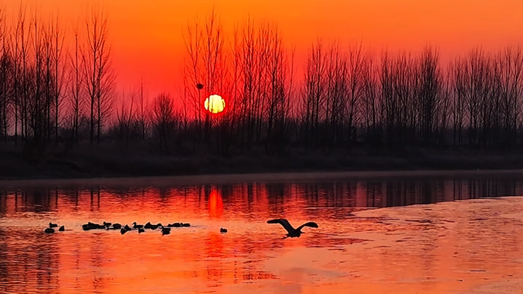 15秒看河北丨霞染湿地鸟掠波